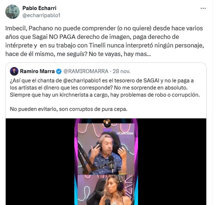 Estos dichos fueron replicados por el legislador Marra que aportó: "¿Así que el chanta de Pablo Echarri es el tesorero de SAGAI y no le paga a los artistas el dinero que les corresponde? No me sorprende en absoluto. Siempre que hay un kirchnerista a cargo, hay problemas de robo o corrupción. No pueden evitarlo, son corruptos de pura cepa", escribió en su cuenta. Rápidamente Echarri salió al cruce y apuntó contra ambos.
