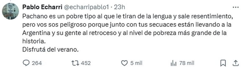 "Imbecil, Pachano no puede comprender (o no quiere) desde hace varios años que Sagai NO PAGA derecho de imagen, paga derecho de intérprete y en su trabajo con Tinelli nunca interpretó ningún personaje, hace de él mismo, me seguís? No te vayas, hay mas…", escribió en referencia a Marra mientras que sobre Pachano: "Es un pobre tipo al que le tiran de la lengua y sale resentimiento, pero vos sos peligroso porque junto con tus secuaces están llevando a la Argentina y su gente al retroceso y al nivel de pobreza más grande de la historia. Disfrutá del verano".