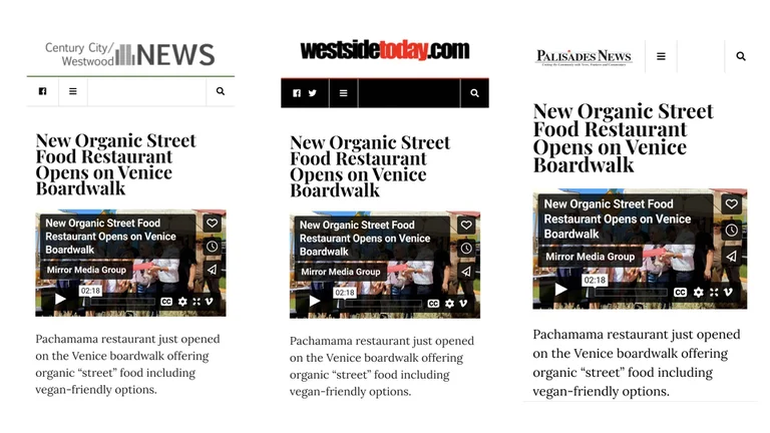 “Vannucci ha resucitado su concepto de restaurante como el Pachamama Beach, más informal. Situado directamente en el tablero de Venice Beach, el restaurante tiene varias mesas de picnic con un mostrador para pedir y ofrece un menú de sándwiches, empanadas, tacos, ceviche, zumos, té y café” agregó otro portal, llamado sandiegoville.com.