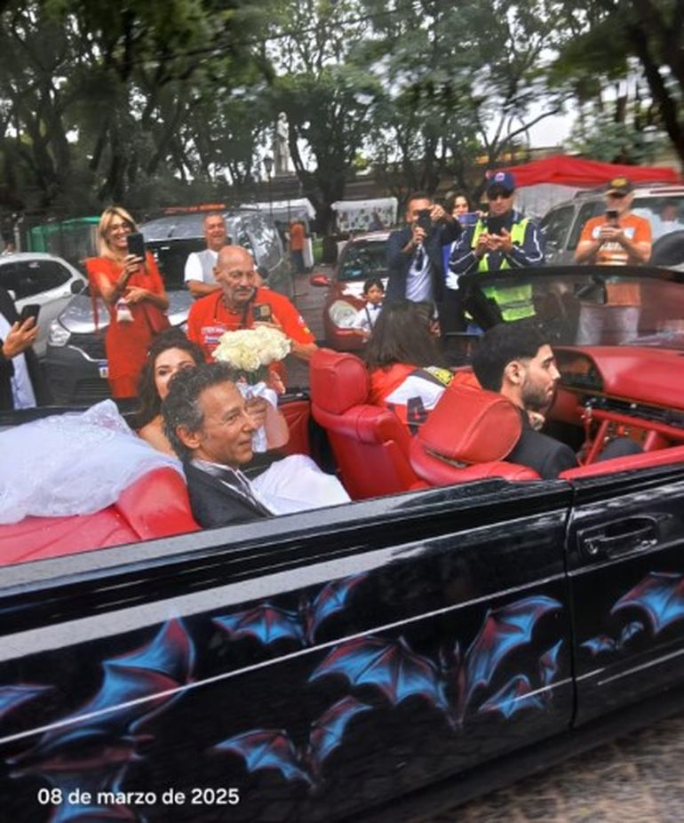 Las redeso sociales permitieron que se viralicen distintas imágenes filmadas en la intimidad de la celebración donde el Padre César, también conocido como “El cura rockero”, guio la ceremonia de Javier y Paola ante los ojos de los presentes. Con el elegante look de ambos, él con un sencillo traje oscuro y ella con un vestido blanco entallado y con una larga cola, salieron de la iglesia y se subieron a un auto descapotable similar al Batimóvil de la reconocida película Batman.