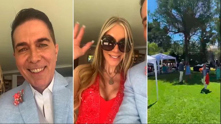 Barili lució un traje de color celeste que acompañó con una flor roja. "Acá estoy con mi esposa. No se arrepintió", dijo el periodista mientras besaba a Lara quien lució unas gafas negras y un vestido con detalles de encaje rojo.