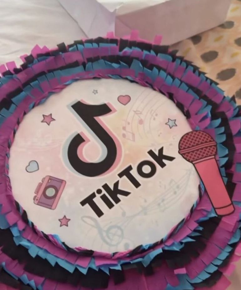 Una de las protagonistas de la fiesta fue una gran piñata con el logo de TikTok en colores pasteles hecha a mano exclusivamente para el cumpleaños de la pequeña. La joven adora bailar y es fanática de la red social de origen chino que es popular por sus challenges.