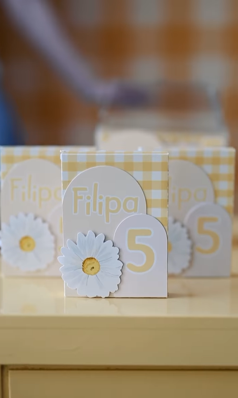 La ambientación fue uno de los ejes centrales del evento. El espacio se transformó con margaritas gigantes en tonos blanco, amarillo, rosa y durazno, acompañadas por globos en la misma paleta. El nombre de la homenajeada se destacó en el fondo del candy bar, decorado con cuadros vichy y flores naturales, replicando la estética alegre y floral que caracteriza a la serie.