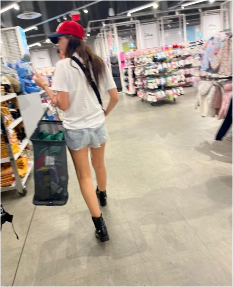 En su día de compras, la actriz lució un look urbano y casual que incluyó un short de jean, una remera blanca holgada, borceguíes y una gorra cup, elementos que forman parte de su estilo personal y que mostraron su elegancia incluso durante una jornada de compras informal.