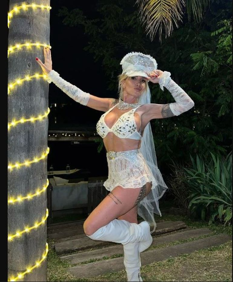 Además, las chicas la vistieron con un outfit mega sexy y sensual: un corpiño blanco con piedras y tul, pollera tiro alto de encaje sostenida por un cinturón de strass y una bombacha colaless en el mismo tono. A su llamativo look lo completó con una gorra en tono plateado y unas botas largas que hacían juego con sus prendas que eran un fuego. Sus amigas vistieron prendas similares, pero en tonos más oscuros y con medias red.