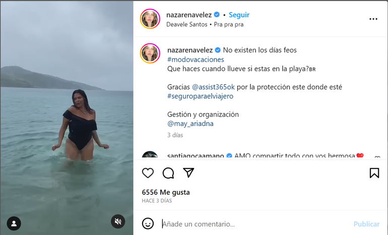 Por lo pronto, Nazarena Vélez se encuentra disfrutando de sus vacaciones con la compañía de su pareja Alejandro Caamaño. Ni la lluvia resulta un impedimento para que ella se encuentre pasando sus días en las playas de Arraial do Cabo y alejada de las preocupaciones diarias.