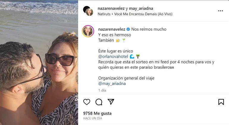 Para salir un poco de la rutina, Nazarena Vélez decidió tomarse unos días de descanso y partió rumbo a Brasil para disfrutar de la playa y de un momento a solas con su esposo Alejandro Caamaño. En este sentido, se encargó de mostrar los detalles de su viaje en su cuenta de Instagram.