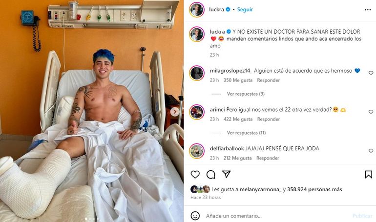 Luck Ra sorprendió y preocupó a todos sus seguidores al compartir en sus redes sociales imágenes internado en un hospital donde exhibe su pierna derecha con una venda que llega a pocos centímetros de la rodilla derecha. Rápidamente otras figuras de los medios de comunicación le eviaron un mensaje de apoyo para que transite la etapa de mejor manera.