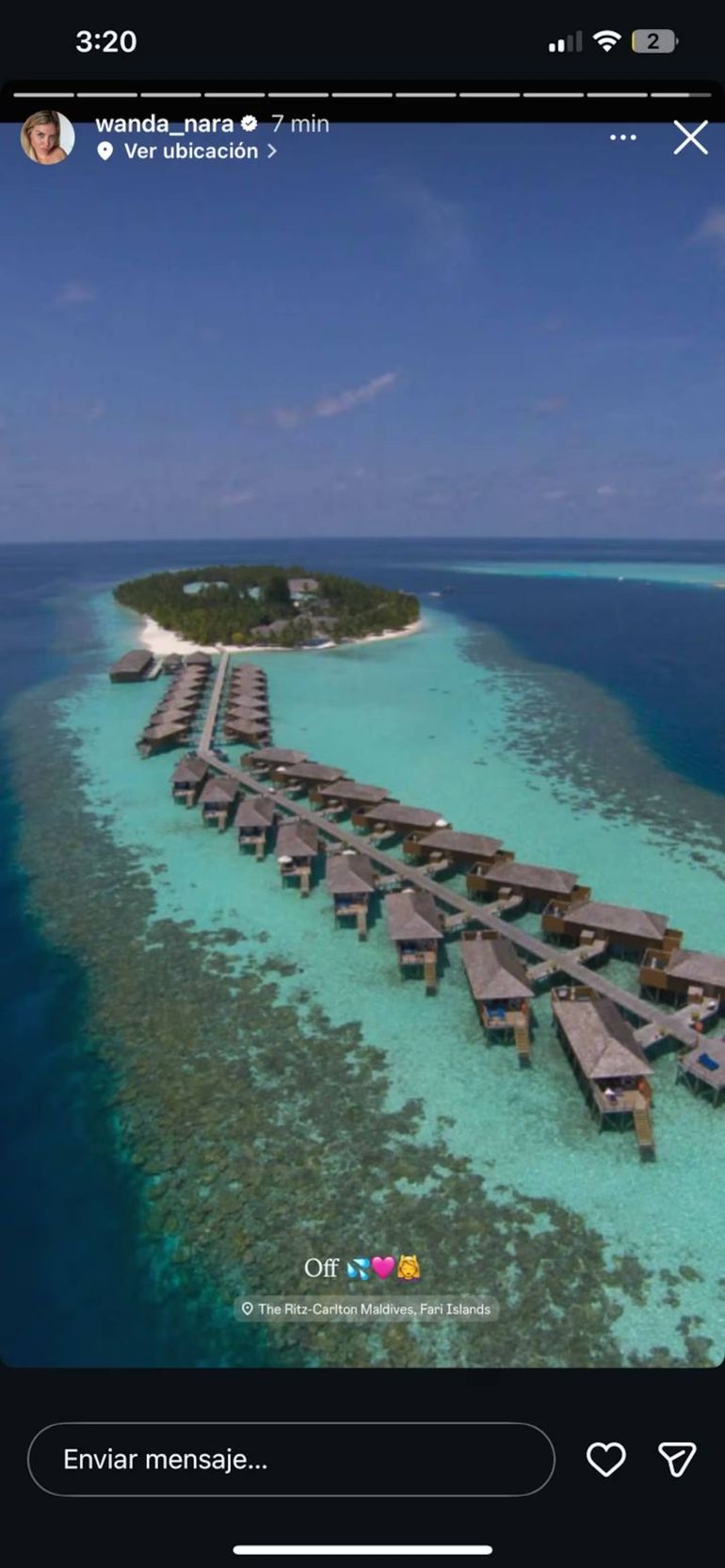 Las imágenes fueron publicadas en sus historias de Instagram y rápidamente generaron repercusión entre sus seguidores. En las postales se observa una vista aérea del exclusivo resort The Ritz-Carlton Maldives, Fari Islands, donde la mediática decidió pasar unos días de descanso.