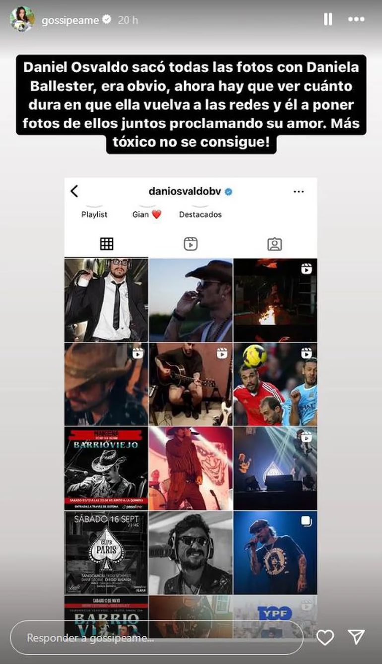 Así lo reflejó la especialista en chimentos en redes, Pochi de @gossipeame en Instagram, al ver que el exfutbolista borró todos sus románticos posteos con Daniela: “Daniel Osvaldo sacó todas las fotos con Daniela Ballester. Era obvio, ahora hay que ver cuánto dura que ella vuelva a las redes y él en poner fotos de ellos juntos proclamando su amor. ¡Más tóxico no se consigue!”, escribió con las pruebas.