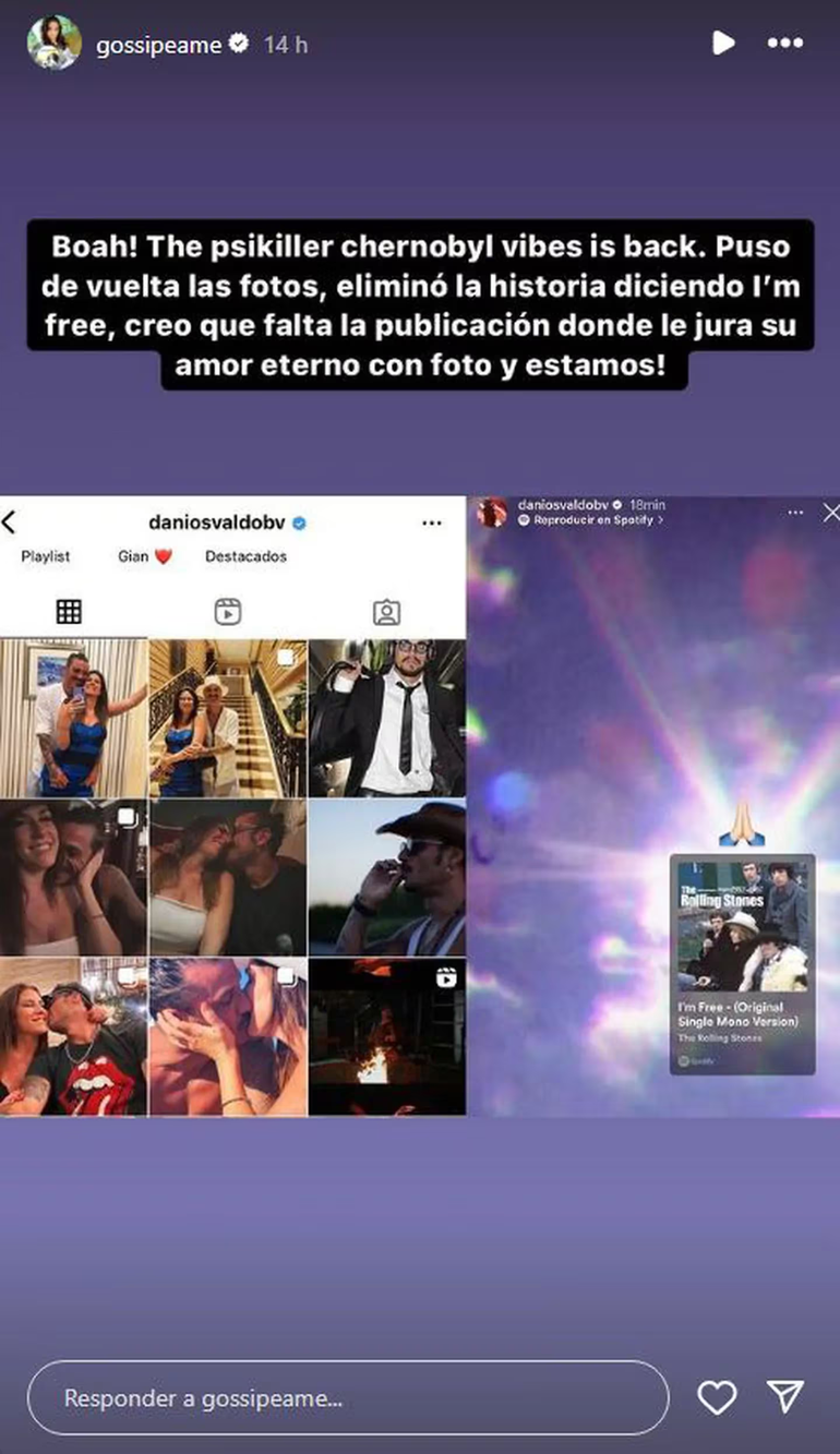 “4:53 sacó las fotos”, añadió después, tirando por la borda lo que había hecho antes y deslizando que la relación atraviesa un nuevo terremoto. Por su parte, Daniela cerró su cuenta personal de Instagram.