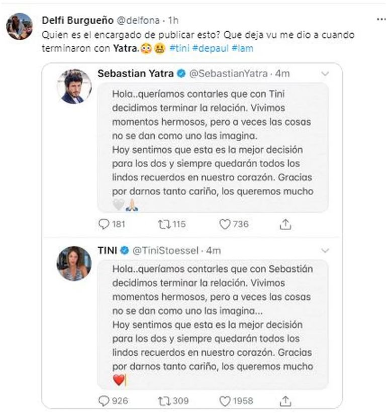 En la noche del martes Tini Stoessel y Rodrigo de Paul sorprendieron a todos al anunciar su separación. La cantante y el futbolista decidieron terminar su relación y las versiones del por qué tomaron esta decisiones son miles, sin embargo, algunos usuarios descubrieron una similitud con la separación que la artista tuvo con Sebastián Yatra.