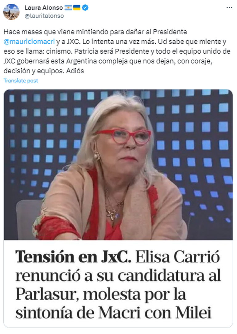 En mayo del corriente año la dirigente política había afirmado en la Mesa de Mirtha Legrand, y en forma de broma, sobre su situación amorosa: "Estoy en pareja con tantos". En esa misma entrevista la política se refirió sobre su reconocido meme que aún circula en las redes sociales.