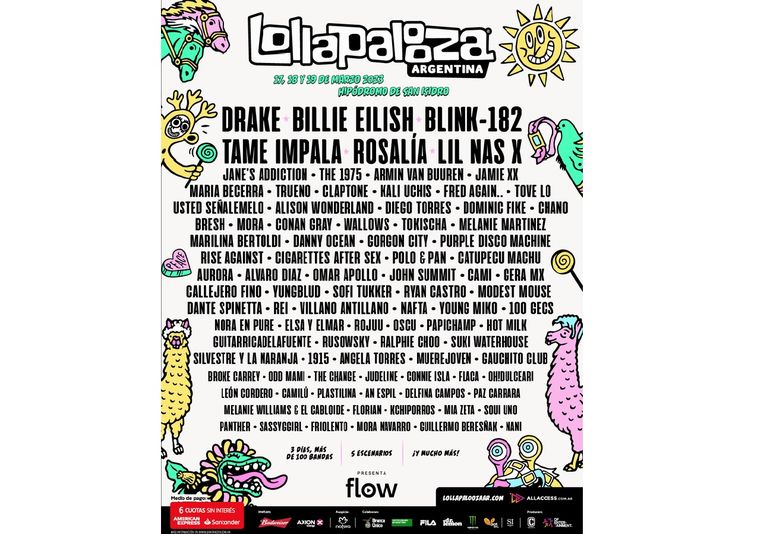 Drake, Billie Eilish, Blink-182, Tame Impala, Rosalía, Lil Nas X, Jane’s Addiction, The 1975, Armin Van Buuren, Jamie XX / María Becerra, Trueno, Kali Uchis, Fred Again, Claptone, Tove Lo, Usted Señalemelo, Alison Wonderland, Melanie Martínez, Diego Torres, Chano, Mora, Conan Gray, Wallows, Tokischa, Danny Ocean, Dominic Fike, Bresh, Purple Disco Machine, Marilina Bertoldi, Gongon City, Alvaro Diaz, Cigarettes After Sex, Polo & Pan, Catupecu Machu, Rise Against, Omar Apollo, Callejero Fino, Cami, Aurora, John Summit, Ryan Castro, Dante Spinetta, Rei, Gera Mx, Villano Antillano, Nafta, Young Miko, Modest Mouse, Hot Milk, Yungblud, Sofi Tukker, 100, Gecs, Elsa y Elmar, Rojuu, Guitarricadelafuente, Rusowsky, Ralphie Choo, Suki Waterhouse, Oscu, Alejo Isakk, Papichamp, 1915, Angela Torres, Silvestre y La Naranja, Muerejoven, Gauchito Club, Broke Carrey, The Change, Judeline, Odd Mami, Connie Isla, Oh! Dulceari, León Cordero, Nora En Pure, Camilú, Plastilina, An Espil, Delfina Campos, Paz Carrara, Melanie Williams & El Cabloide, Florian, Kchiporros, Mia Zeta, Soui Uno, Panther, Sassyggirl, Friolento, Mora Navarro, Guillermo Beresñak, Nani y Flaca.
