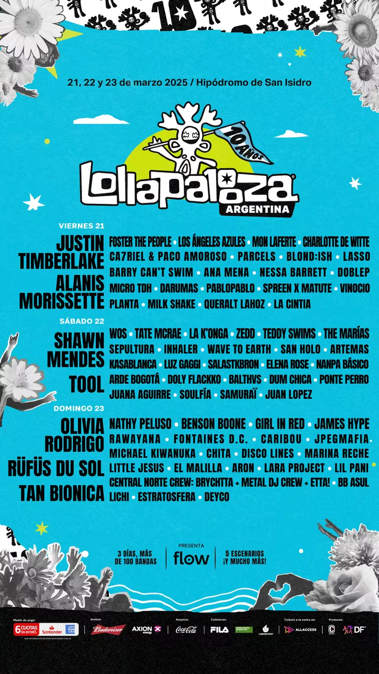 La organización del Lollapalooza 2025 confirmó la grilla de los tres días del monumental evento. Este se realizará el 21, 22 y 23 de marzo del próximo año en el hipódromo de San Isidro, ubicado a 30 minutos del centro porteño.