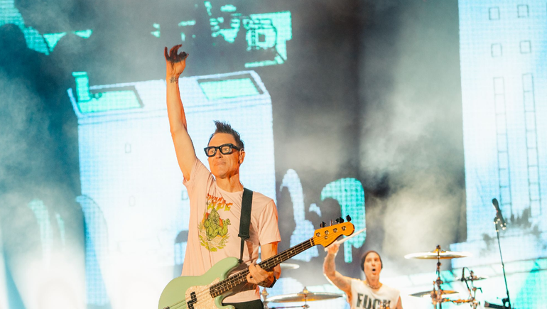 A los costados del baterista, claro, Tom DeLonge y Mark Hoppus completaron el triángulo y salieron arando con "The Rock Show" y "Family Reunion" pegaditas. La reconocible voz nasal del guitarrista, que siempre fue más chistoso que virtuoso, sonaba ajada por el paso del tiempo y le costaba llegar a sus alaridos más altos. El bajista, aunque exigido, sonó algo más cómodo y además asumió el rol de "comunicador oficial" ante el público. "First, thank you. Second, Francia", dijo como guiño algo tardío hacia la obtención del último mundial por parte de la Selección Argentina justo antes de "Feeling This" y provocó algunas risas.