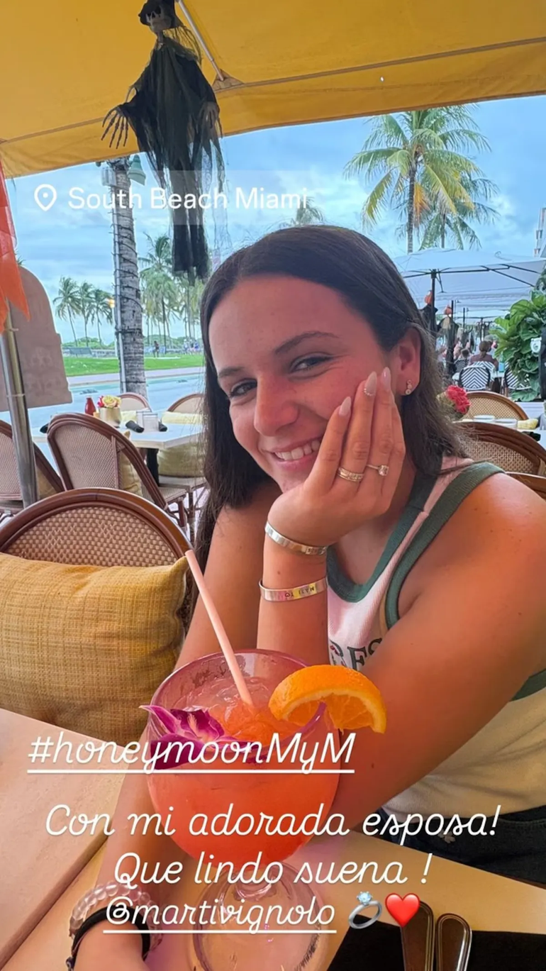 “Floja la vista”, bromeó Matías al mostrar el imponente paisaje que contemplaban desde la ventana: el mar azul, la arena blanca y las palmeras delineando la costa, en una postal de ensueño. El primer día lo aprovecharon al máximo entre tragos en South Beach, paseos por la mítica Lincoln Road y muchas fotos espontáneas que compartieron en sus redes, reflejando la felicidad de la nueva convivencia. “Con mi adorada esposa, ¡qué lindo suena!”, escribió él, celebrando esta nueva etapa. Martina, por su parte, mostró las ojotas personalizadas con las iniciales “M&M” y la fecha del casamiento, 24 de octubre, un detalle romántico que acompañará todo el viaje.