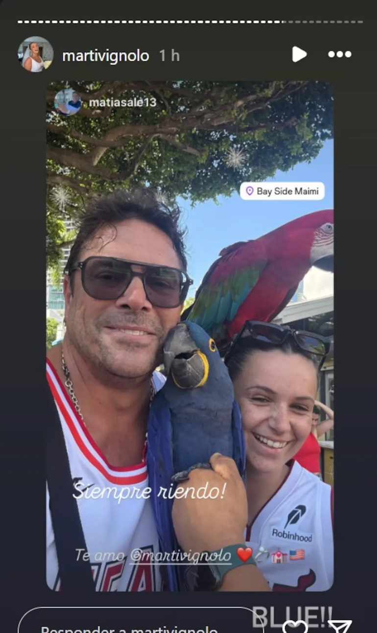 La luna de miel de Alé y Vignolo continúa con postales alegres desde Miami, donde disfrutan cada día como una experiencia única. Entre las imágenes que compartieron, destaca una en la que Martina aparece luciendo una camiseta del Miami Heat mientras posa con dos coloridos loros: uno rojo sobre su cabeza y otro azul en su brazo. “¿Qué es un loro? Un pájaro”, escribió divertida, reflejando el tono distendido del viaje.