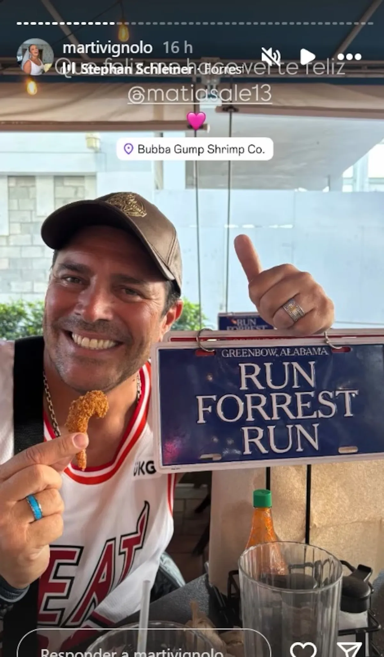 La secuencia se completa con una foto de Matías en el clásico restaurante Bubba Gump Shrimp Co., sosteniendo una porción de camarones junto al famoso cartel “Run Forrest Run”, en guiño a la película de Robert Zemeckis de 1994, Forrest Gump. El actor acompaña la imagen con la frase: “Qué feliz me hace verte feliz”, síntesis perfecta del espíritu del romántico viaje de la pareja recientemente casada.