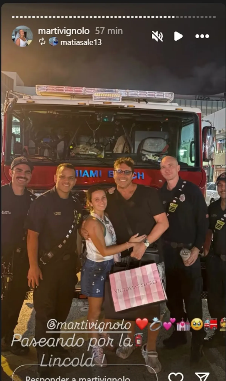 Otra de las postales muestra a Matías Alé y Martina Vignolo en Lincoln Road, abrazados y rodeados por un grupo de bomberos de Miami Beach, posando sonrientes frente a un camión del cuerpo local. Ella sostiene una bolsa de un reconocido local de lencería, en plena tarde de compras. En otra selfie diurna, Matías y Martina vuelven a posar entre loros, transmitiendo complicidad y alegría bajo el lema: “¡Siempre riendo!”.
