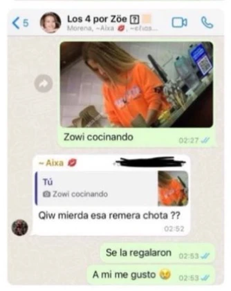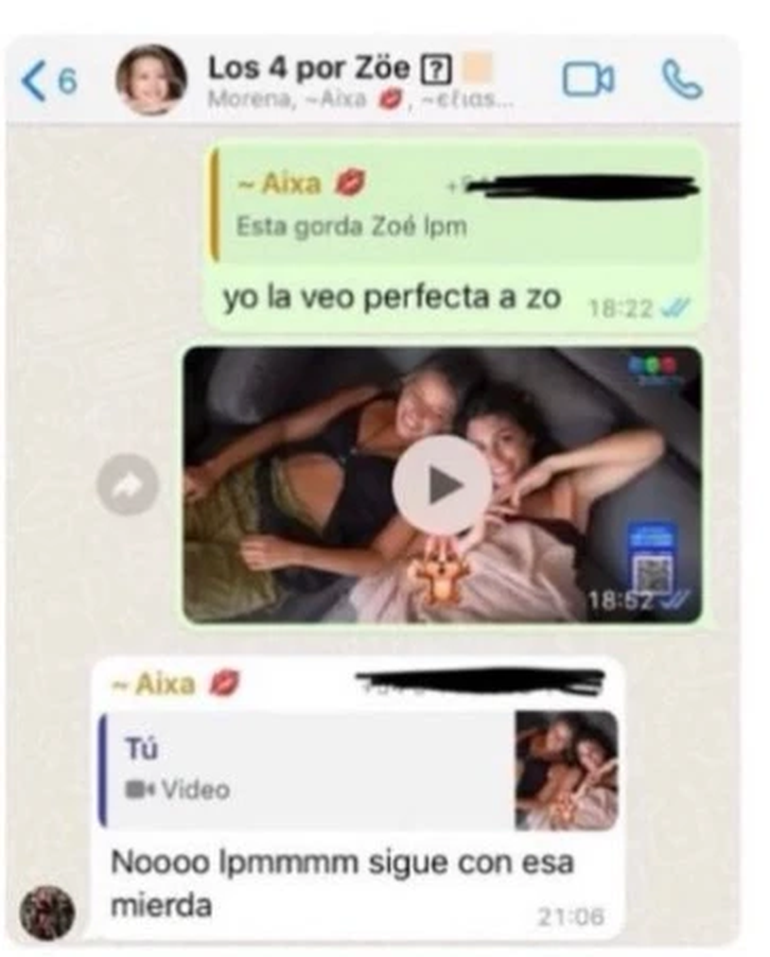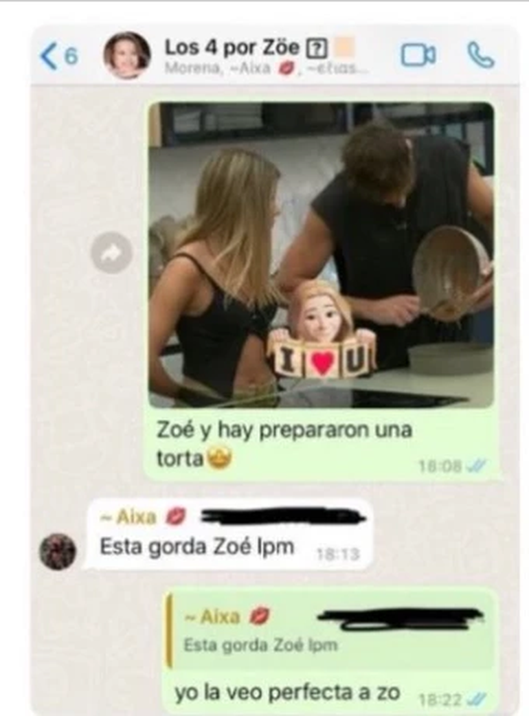 Esta acusación tan fuerte contra Aixa se desprende de la lluvia de capturas privadas que en las últimas horas empezaron a circular en la red social X. Los chats pertenecían a un grupo de WhatApp donde la madre de la rubia participaba. Lo curioso, llamativo, espantoso, es que Aixa se la pasaba hablando mal de su hija, criticando su ropa, sus actitudes, opinando de su cuerpo y de cómo la veía dentro de la casa. Pero lo mas polémico fue que tildó de gorda a Zoe.