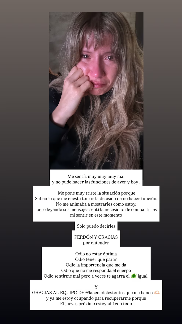 Luego, utilizó su cuenta de Instagram para contar la intimidad del momento: “Me sentía muy, muy, muy mal y no pude hacer las funciones de ayer y hoy”, escribió, dejando expuesta la gravedad de un cuadro físico que no logró superar a tiempo para volver a las tablas.