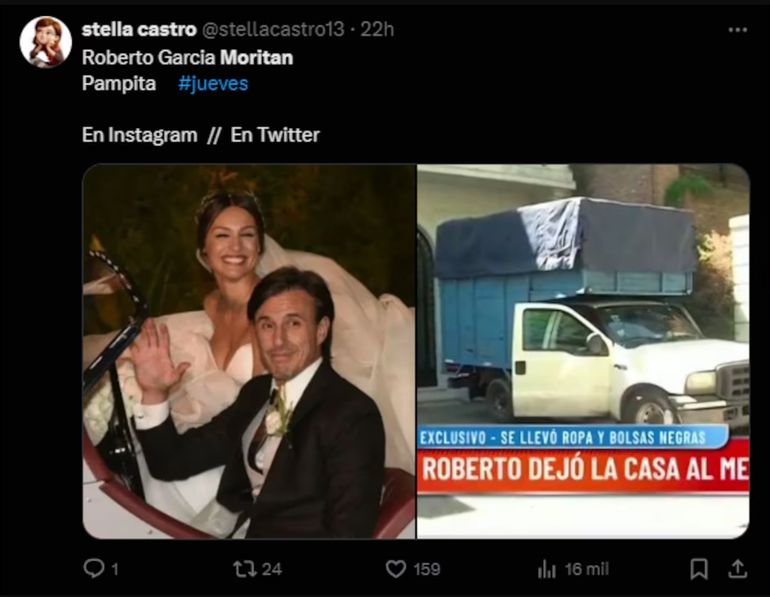 Es que muchos de los tuits que se viralizaron estaban vinculados a Roberto García Moritán. Se debe a que la gente se quejó ante la confirmación de que fueron las infidelidades las que terminaron empujando a que este romance se tire por la borda luego de más de 10 años de construcción.