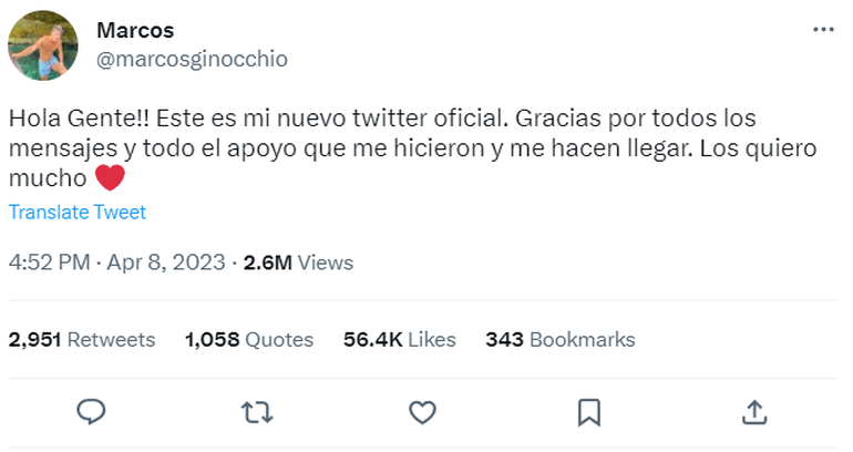 Hace un par de semanas terminó la última edición de Gran Hermano Argentina, una edición que sin lugar a dudas no pasó indiferente para el formato, para el público, ni para los jugadores. El flamante ganador del certamen Marcos Ginocchio se ganó el cariño de la gente que lo demostró en Twitter cuando el campeón contó que se sumaría a dicha red social.