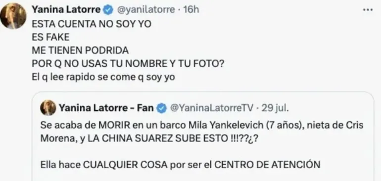 Latorre no solo se solidarizó con la familia Yankelevich sino que también enfrentó un episodio desafortunado en medio del duelo colectivo. Una cuenta anónima en redes sociales, que se hacía pasar por una fanática de ella, apuntó contra China Suárez por publicar una foto en un barco el mismo día en que se conoció la noticia de la muerte de Mila. “Le acaba de morir en un barco Mila Yankelevich (7 años), nieta de Cris Morena, ¿y la China Suárez sube esto? (Una foto en un barco) Ella hace cualquier cosa por ser el centro de atención”, decía el posteo.