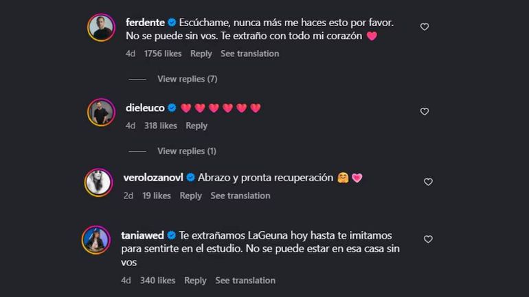 Fer Dente fue uno de los primeros en expresarse: “Escuchame, nunca más me hacés esto por favor. No se puede sin vos. Te extraño con todo mi corazón”. También Sergio Lapegüe se hizo presente con un claro: “Fuerzas Lu, lo que necesites estoy”.