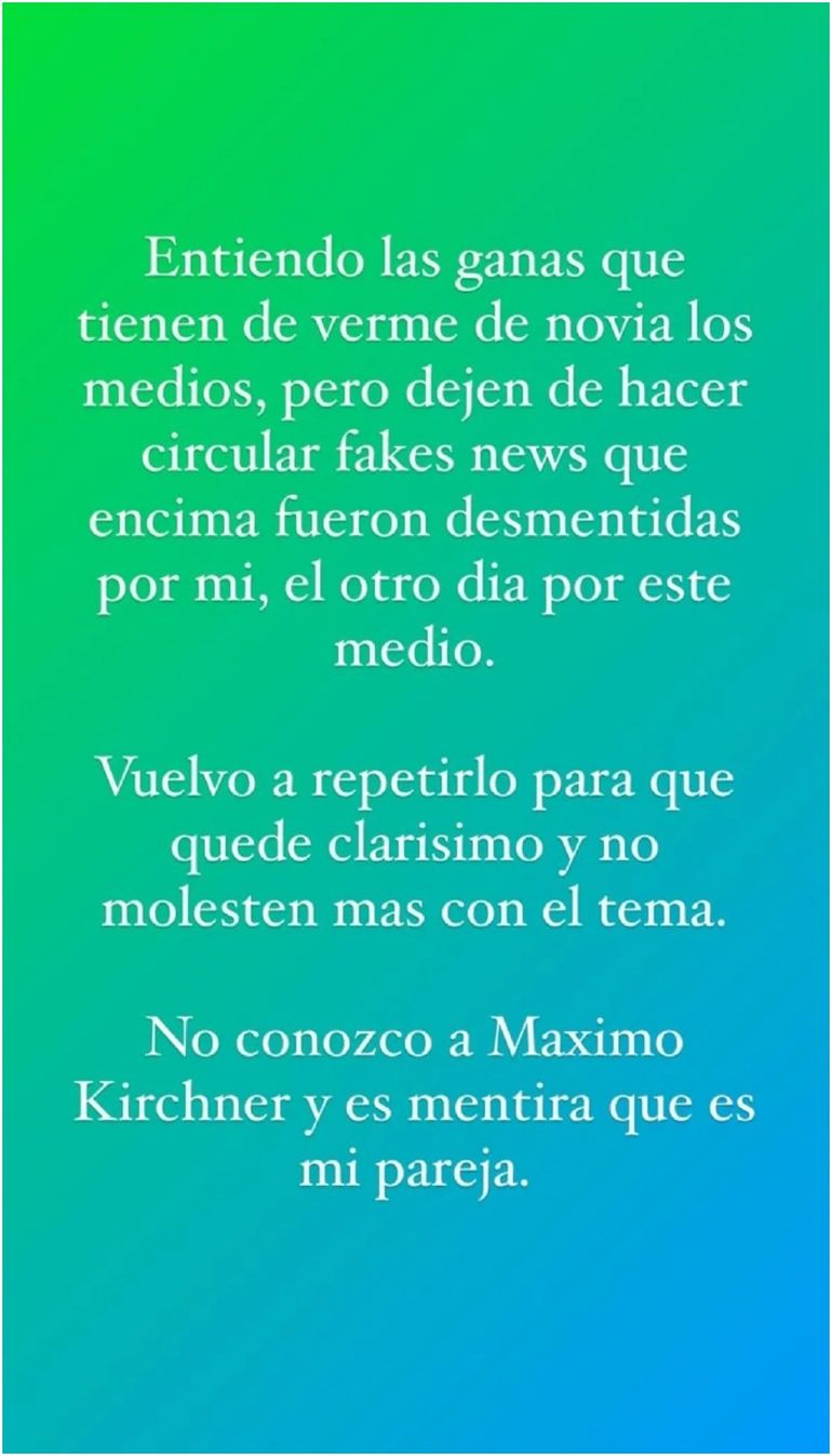 "Vuelvo a repetirlo para que quede clarísimo y no molesten más con el tema. No conozco a Máximo Kirchner y es mentira que es mi pareja", remató Luli.