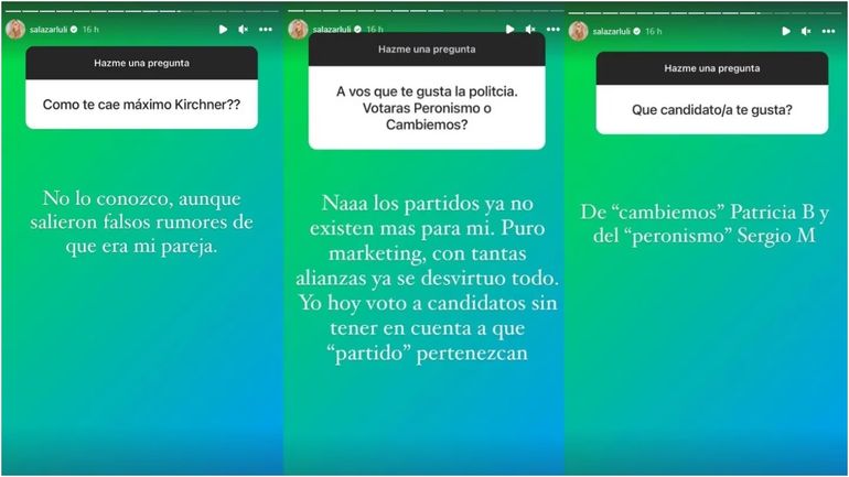 Es que ya hace unos días, uno de sus seguidores le había preguntado a Luli qué opinaba de Máximo Kirchner, ya que la modelo le había permitido a sus seguidores hacerle preguntas desde su instagram: “No lo conozco, aunque salieron falsos rumores que decían que era mi pareja”.