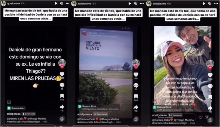 La situación adquiere mayor complejidad con la aparición de fotos que sugieren que Daniela y su ex pareja (con la que salía antes de entrar a Gran Hermano) compartieron un fin de semana juntos en las Termas de Villa Elisa. Esta circunstancia ha generado especulaciones sobre el estado real de su relación con Thiago y empezó a generar dudas sobre si la influencer no habría engañado al ex Gran Hermano.