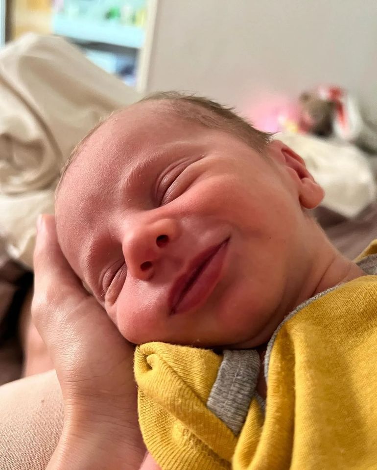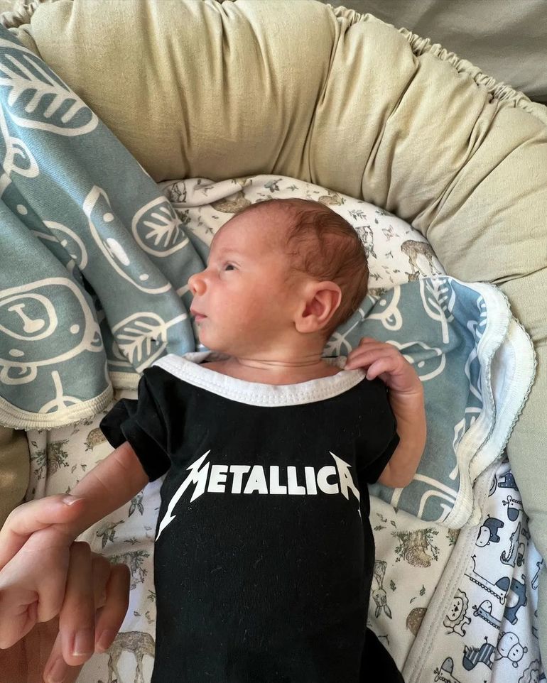 Muy enternecida con su hijo, compartió varias fotos del bebé y sorprendió a sus seguidores por algunas de ellas: el pequeño apareció sonriendo, cuando estaba descansando sobre la mano de su mamá y también con un look muy metalero, al lucir un body de la banda Metallica a su corta edad.