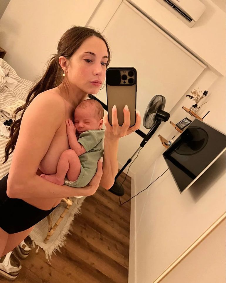 En primer lugar, mostró varias imágenes de su bebé en íntimos momentos de madre e hijo, mientras lo amamantaba, descansaba sobre su pecho o estaba despierto, recostado sobre el hombro de Magui.