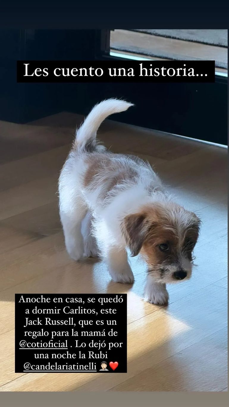 “Anoche en casa, se quedó a dormir Carlitos, este Jack Russell, que es un regalo para la mamá de Coti Sorokin. Lo dejó por una noche la Rubi”, explicó Marcelo Tinelli con un emoji de un corazón y con el de un hombre con la mano en el rostro, manifestando su preocupación.