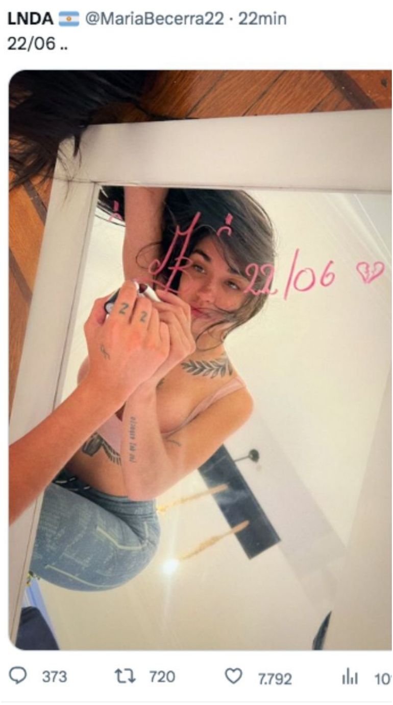 Es que la artista compartió una foto en donde se la puede ver en corpiño, dibujando un espejo con un marcador rosa: "MB 22/06" junto a un corazón roto a la mitad. Sin decir más, todos sus seguidores entendieron rápidamente que se trataba de la fecha donde la Nena de Argentina lanzará su tan esperado hit "Corazón vacío".