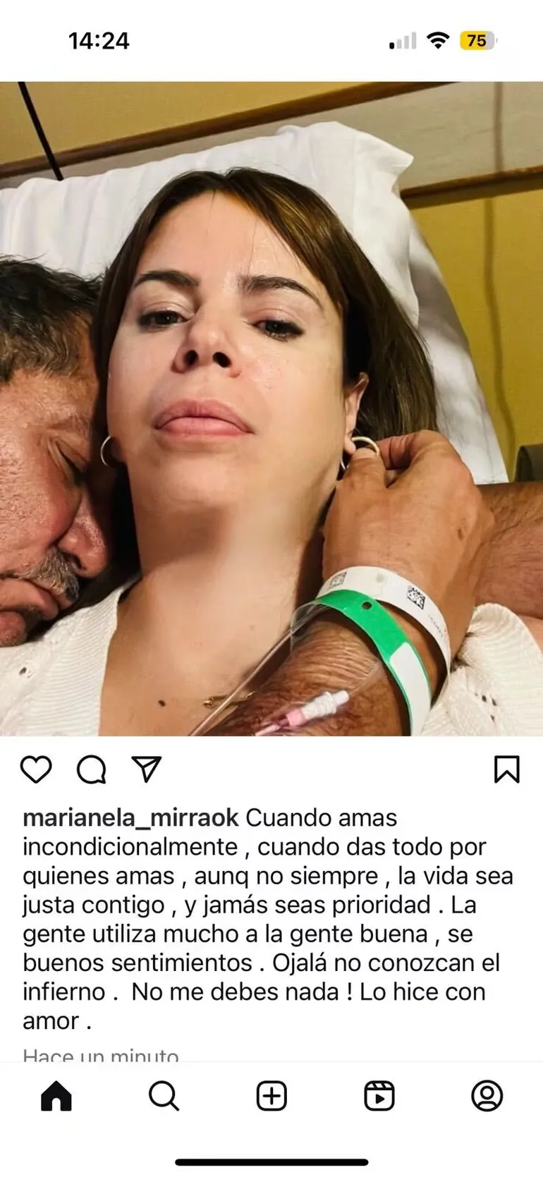 La famosa publicó una foto desde la clínica y le dedicó emotivas palabras para su recuperación: “Cuando amas incondicionalmente, cuando das todo por quienes amas, aunque no siempre, la vida sea justa contigo, y jamás sea prioridad”. “La gente utiliza mucho a la gente buena, de buenos sentimientos. Ojalá no conozcan el infierno. No me debes nada, lo hice con amor”, agregó en la publicación que compartió Marianela Mirra en su cuenta privada de Instagram. Allí la famosa mostró una foto de ella acostada junto Alperovich en una clínica.