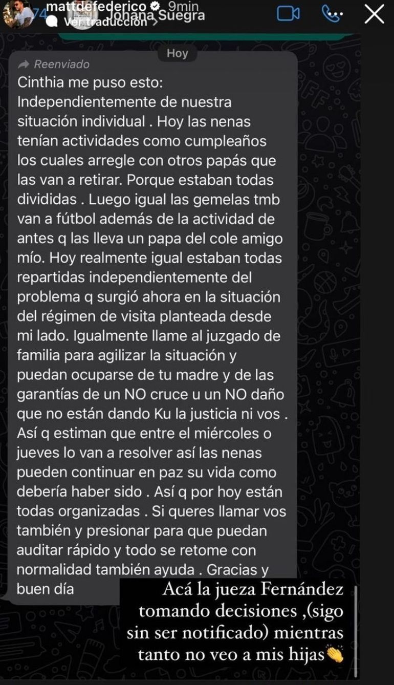 "Acá, la jueza Fernández tomando decisiones. Yo sigo sin ser notificado y mientras tanto, no veo a mis hijas", fue la respuesta de Matías ante la decisión de Cinthia.