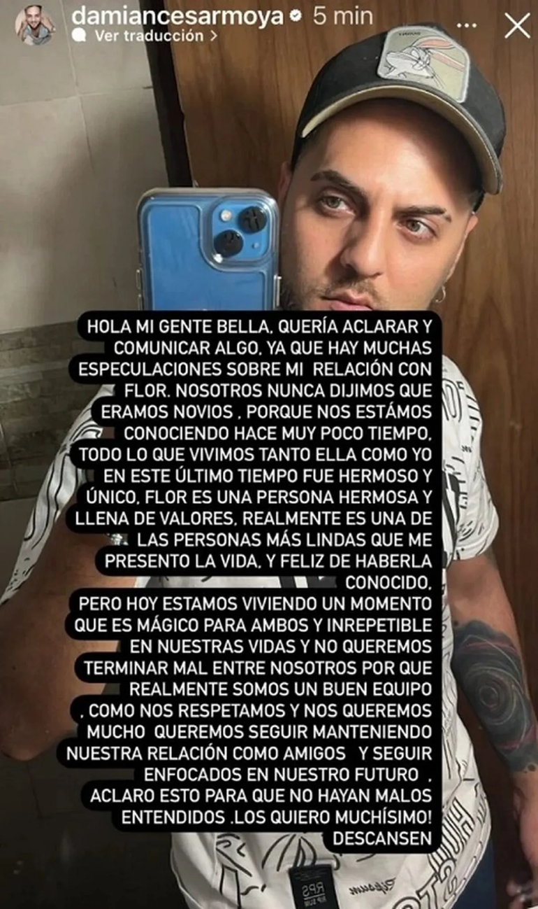 Incluso, ellos mismos hablaron al respecto de la buena onda que tenían, que se estaban conociendo más y hasta se mostraron a los besos en público en una cena que compartieron los ex participantes del reality. Lo cierto es que desde su cuenta de Instagram, Damián compartió un comunicado donde aclara qué tipo de relación tiene con Flor, remarcando que ya no son novios.