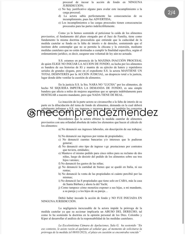 Además, las defensoras deslizaron que la empresaria busca evitar “informar sus ingresos, bienes, costos, egresos, pero también los concretos ingresos, bienes y egresos del demandado”, acusación que suma tensión al conflicto mediático y judicial. La crítica también incluyó al juez, al que las abogadas acusaron de prevaricato por su actuación permisiva con la modelo y estricta con el ex jugador de la Selección Argentina.