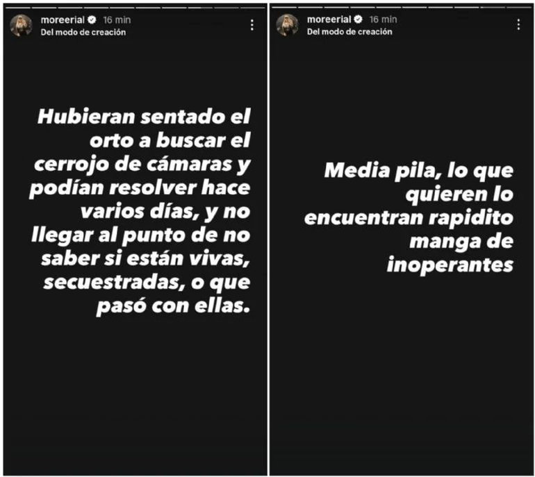 "Hubieran sentado el ort* a buscar el cerrojo de cámaras y podían resolver hace varios días, y no llegar al punto de no saber si están vivas, secuestradas o qué pasó con ellas. Media pila, lo que quieren lo encuentran rapidito, manga de inoperantes", lanzó sin filtros.