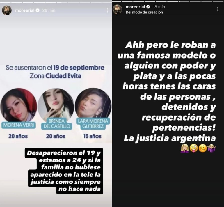 Luego, sus seguidores le preguntaron si conocía a alguna de las chicas desaparecidas, pero ella reveló: "Yo no las conocía pero mis amigos sí. De todas maneras yo creo que se manejan muy mal. Si la familia no hubiese cortado la rotonda primero, nadie se hubiese enterado. Hubiesen desaparecido como tanta gente que desaparece y lo han dejado ahí".