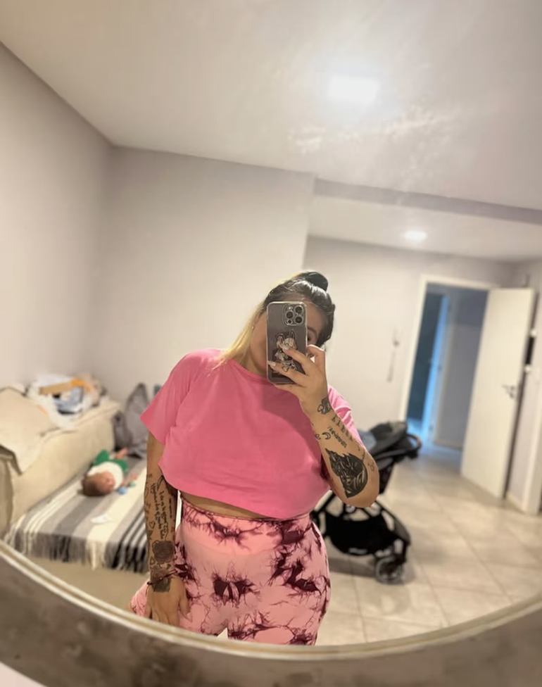 La mediática se puso unas calzas rosas cintura alta con un diseño con detalles color uva en diálogo con una remera corta, que deja al descubierto su abdomen, de un tono más oscuro, fucsia. De fondo, se puede ver a su bebé recostado mientras ella se saca selfies.