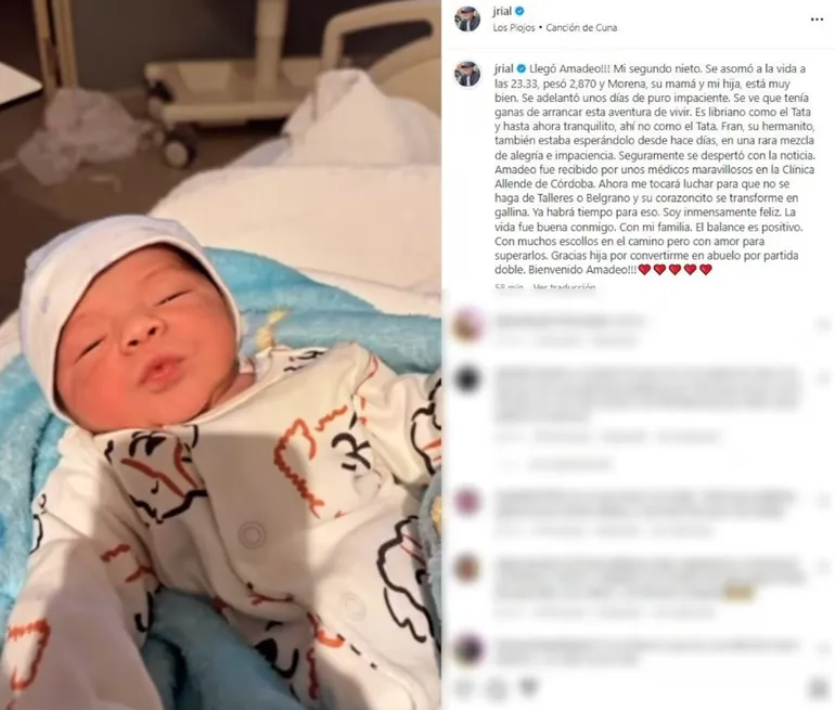 La llegada de Amadeo, su segundo nieto, habría sensibilizado a Jorge Rial, a tal punto que en sus redes sociales no pudo ocultar la emoción por esto: “Llegó Amadeo. Mi segundo nieto. Se asomó a la vida a las 23.33, pesó 2,870 kilos y Morena, su mamá y mi hija, está muy bien. Se adelantó unos días de puro impaciente”.