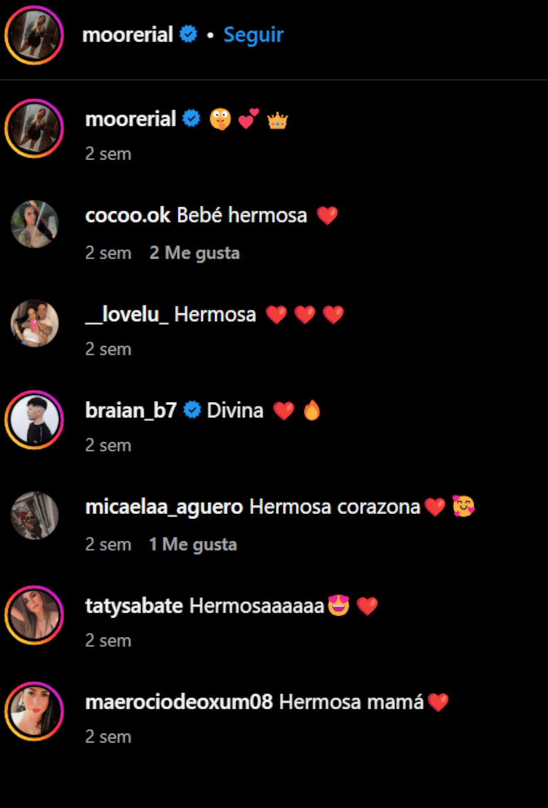 Al pie de las imágenes, Morena Rial recibió todo tipo de comentarios buena onda por parte de sus fanáticos. “Bebé hermosa”, “hermosa”, “Divina”, “Hermosa mamá”, le firmaron sus seguidores, elogiándola.