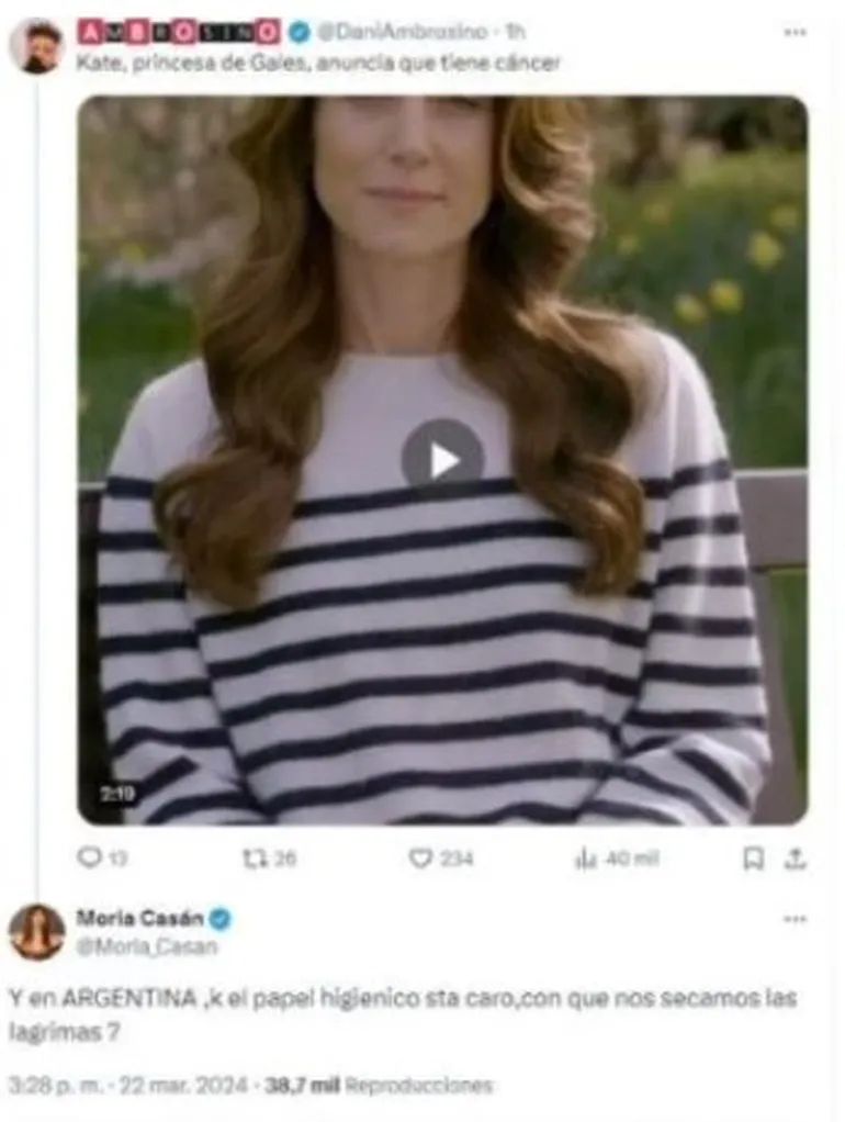 Quien se expresó sobre la situación que atraviesa la princesa fue la reconocida modelo Moria Casán, quien despertó un sinfín de críticas en las redes sociales por un comentario realizado en X (ex Twitter). Es que la actriz citó el video donde la Princesa hace el anuncio y escribió: “Y en Argentina que el papel higiénico está caro. ¿Con qué nos secamos las lágrimas?", generando mensajes de repudio en las redes sociales. De hecho, horas más tardes, en X se convirtió en tendencia un hashtag que lleva el lema “con el cáncer no se jode”.