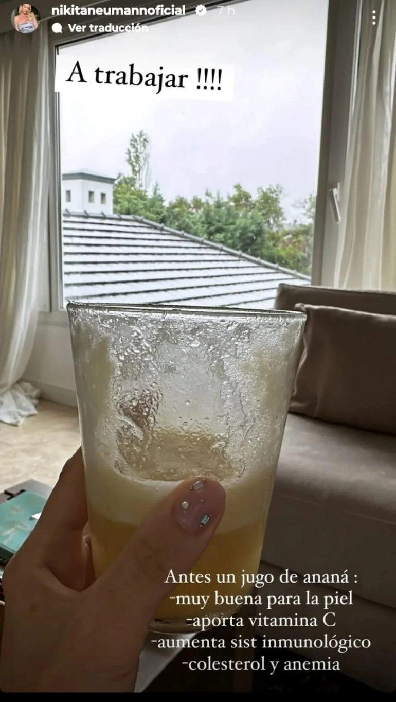 La modelo realizó un posteo antes de irse a trabajar como todas las mañanas y pasó a contar qué bebida toma para estar plena, pero también por los beneficios que le brinda a su salud. “A trabajar… antes, un jugo de ananá”, expuso Nicole en sus historias de Instagram, con el vaso en su mano.