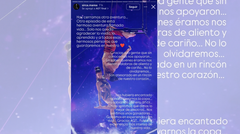 En otro momento de la publicación, la pareja latina se mostró apenada por el resultado. “Nos hubiera encantado ganar.. llevarnos la copa.. pero sabíamos que era difícil. Aun así sentimos que dimos lo mejor de nosotros. Nos sentimos unos ganadores. Ganamos en experiencia y en vida. Gracias AGT. Fuiste la experiencia más intensa de nuestra vida”, concluyó el dúo que obtuvo el 9° lugar en el certamen.