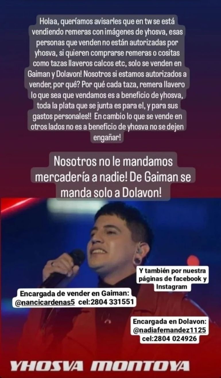 “Hola, queríamos avisarles que en Twitter se están vendiendo remeras con imágenes de Yhosva. Esas personas que venden no están autorizadas por él. Si quieren comprar remeras o cositas, solo se venden en Gaiman y Dolavon”, explicaron.